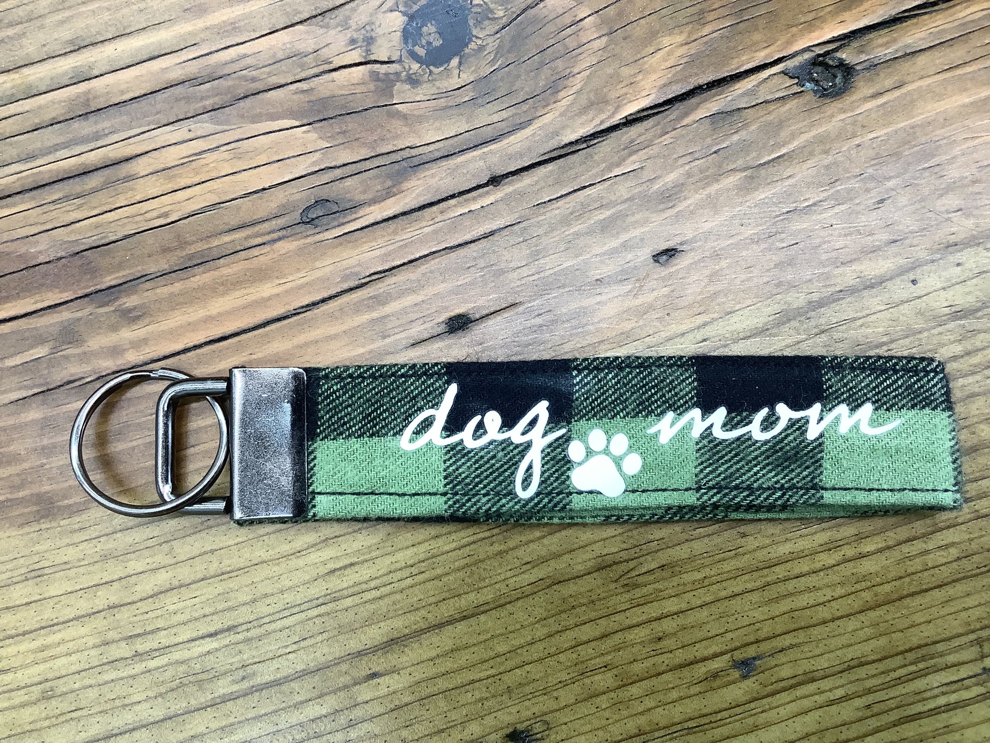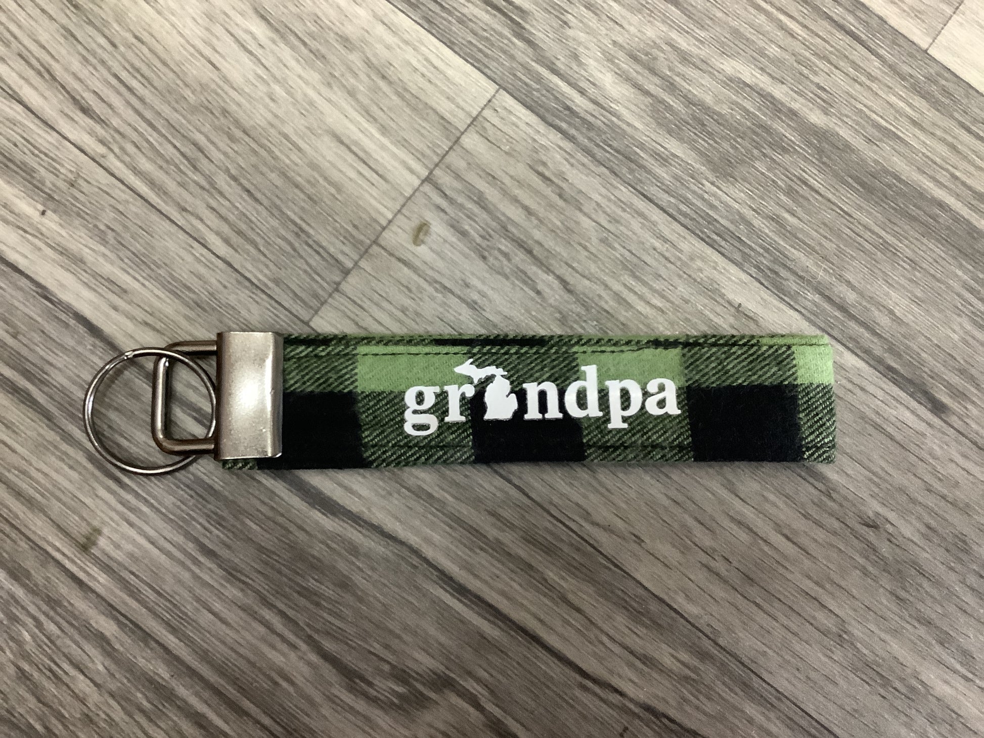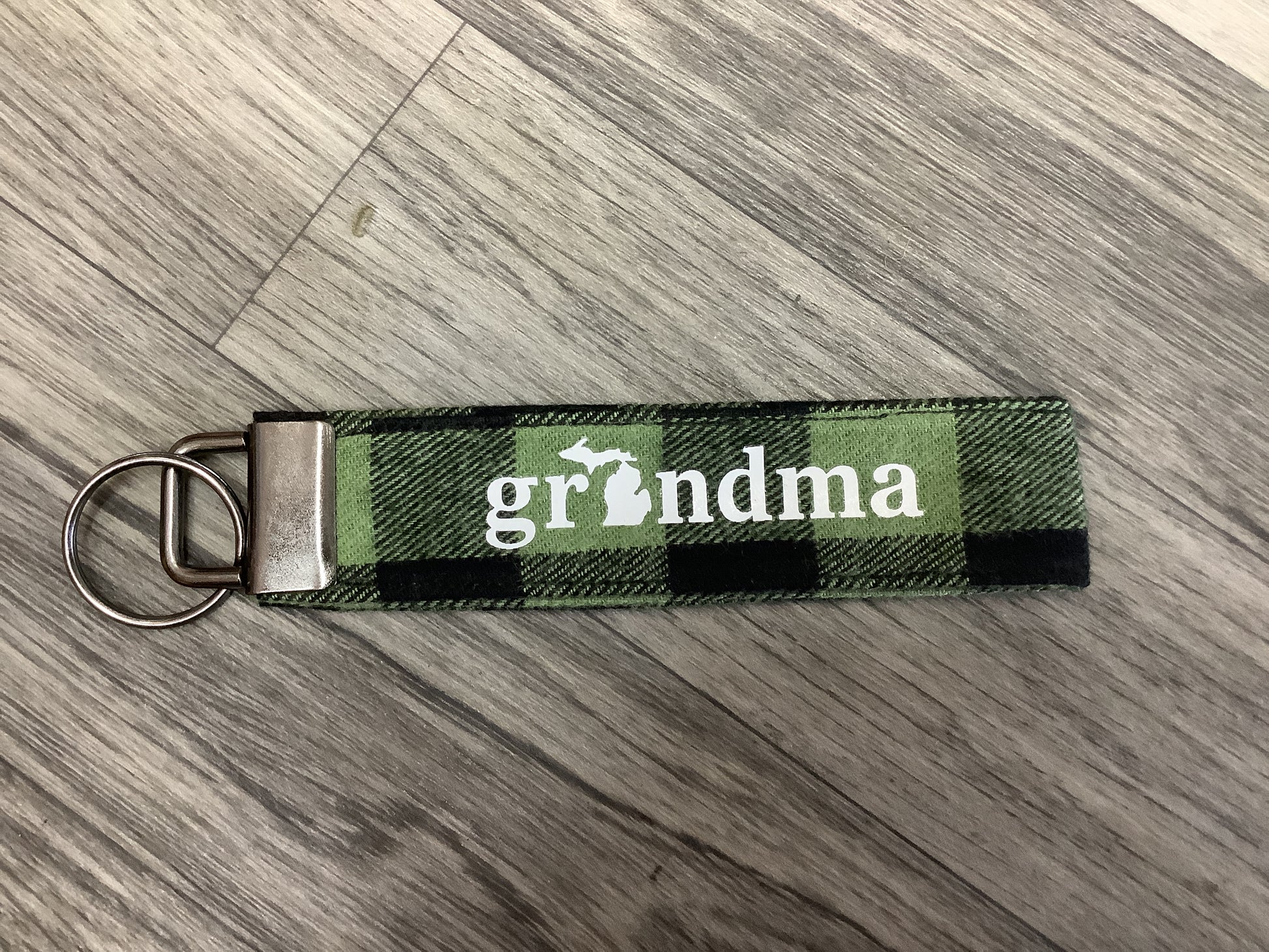 5.25" long keychain with a gunmetal fob and up-cycled plaid fabric with hand-pressed lettering. Made in Williamston, Michigan.