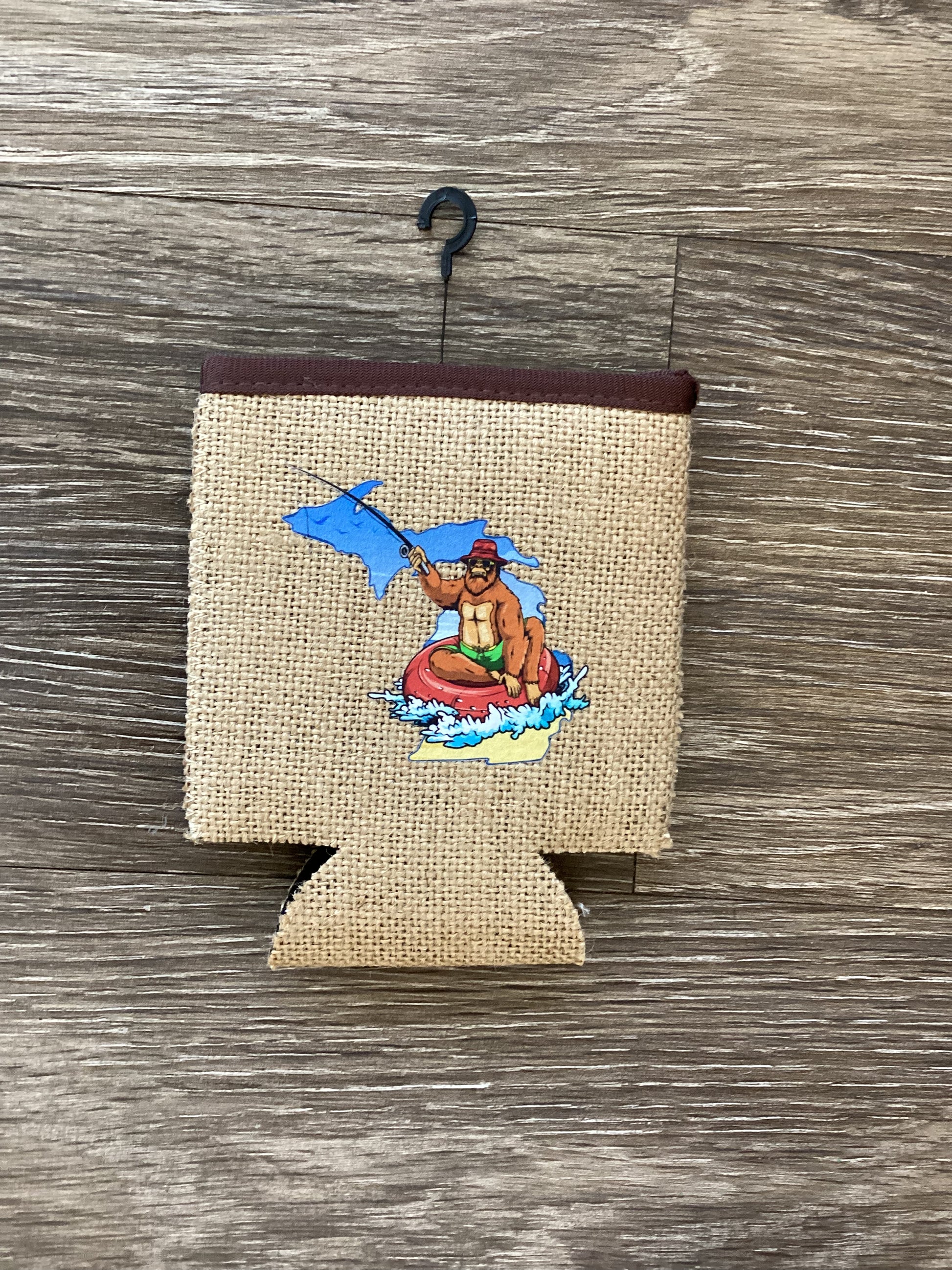 Sasquatch Tube Fishing Beach - Michigan - Burlap Koozie