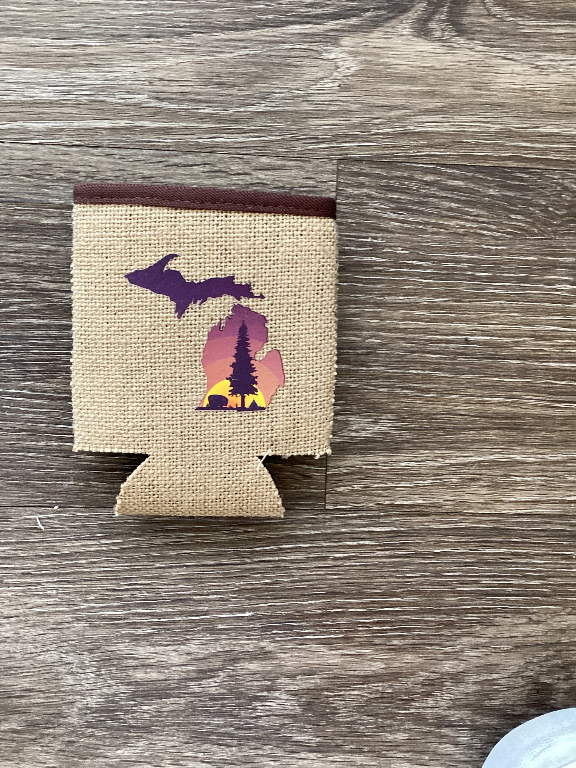 Sunrise camper - Michigan - Burlap Koozie